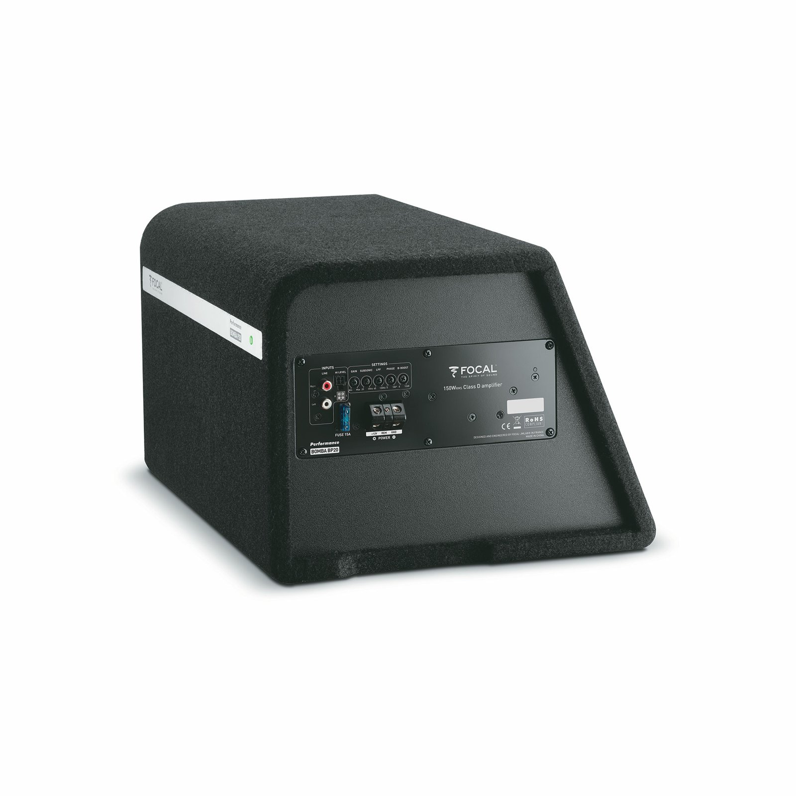 The Focal BOMBA BP20 is a compact yet powerful active bandpass subwoofer, featuring a 20 cm woven glass-fiber cone and a built-in 300W Class D amplifier. Designed with a bass-reflex enclosure and contoured port to minimize noise, it delivers deep, punchy bass while saving trunk space.